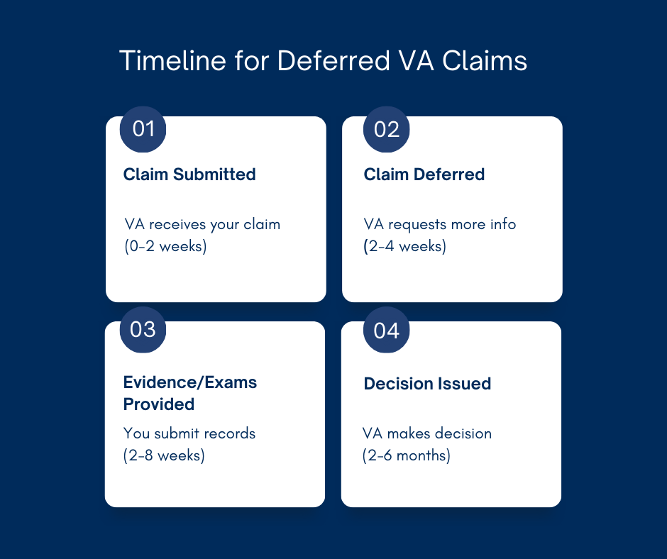 Deferred VA claims can feel stressful, but most are eventually resolved within a few months, even if complex cases take longer. The key things to remember are why your claim was deferred, what evidence the VA needs, and how quickly they process your case.
