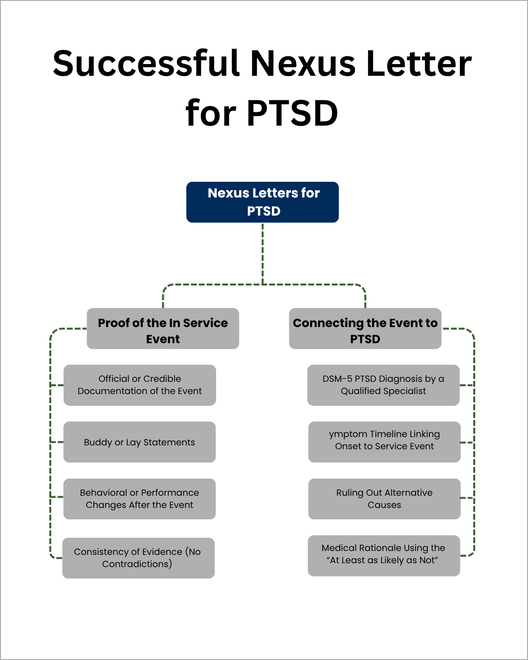 This is where many PTSD nexus letters fall short. The provider must explain why your PTSD isn’t caused by something else — like preexisting conditions or post-service events.